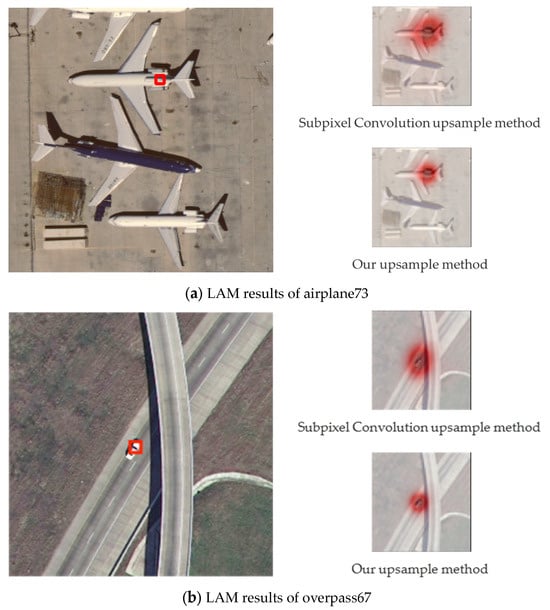 We applied LAM to analyze both the convolution upsampling method and our SUB, with results shown in Figure 5. In the airplane scene, we selected the engine part as the target region. It can be seen that there are many pixels in the LAM results sampled on the convolution that do not match the semantic information of the airplane, also have an impact on the SR results, and this additional introduction of extraneous pixel information degrades the quality of the SR reconstruction. While the LAM results of our method are more focused on the part that matches the target semantics, most of the pixels with large contributions are focused on the airplane engine part, and SR reconstruction based on the semantic information is an important reason why our EHNet can obtain higher performance. Similar results also appear in the overpass scene, we selected a car on the road as the target region, and our method also obtains results that are more focused on the car part, which leads to better reconstruction results.