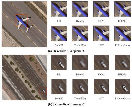 In addition to the quantitative comparisons discussed above, we also conducted a qualitative analysis of super-resolved image quality. Figure 6 presents the visual results for two scenarios from the UCMerced dataset: airplane and freeway. In the case of ‘airplane78′, our method successfully recovers the texture of the engine part while maintaining sharp edges. For ‘freeway97’, our EHNet uniquely restores the car windows, a detail not achieved by other methods. Moreover, the super-resolved image exhibits clearer lane lines, demonstrating EHNet’s significant advantage in recovering image details.