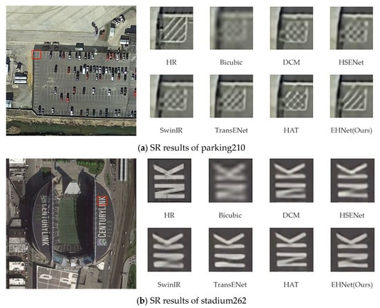 Figure 7 shows two examples of the AID dataset. For parking210, our proposed method successfully recovers clear marker lines, while the other methods are either very blurred or have checkerboard artifacts. Furthermore, in the super-resolution result of ‘stadium262’, our model achieves sharper edges around letters, further evidencing its superior performance in enhancing details.