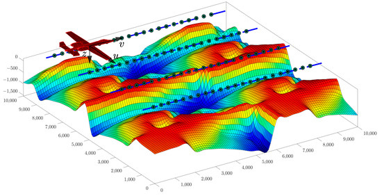 The above simulated geomagnetic map is not representative. Therefore, six magnetic dipoles are used in this paper to simulate the local geomagnetic anomaly region. The relevant parameters are shown in Table 3. The z-axis is specified as the positive direction, the normal field of geomagnetic background is set to 48,000 nT, and the true value of the simulated geomagnetic map with a regional resolution of 50 × 50 m is generated according to the relevant parameters, as shown in Figure 10a. In order to obtain the magnetic samples in the flight-line during the simulation of the aeromagnetic survey, the magnetic data of simulated flight along the Y direction is taken as the measured value on the constructed geomagnetic map, the in-line resolution is set to 250 m, and the flight line spacing is set to 500 m. The schematic diagram of the measurement points is shown in Figure 10b.
