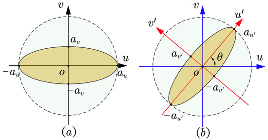 At this time, the diagram of direction–range is shown in Figure 4b. The surveying direction (selected axis) is at the azimuth angle to the characteristic direction of the geomagnetic data (elliptic principal axis). The processing goes through three processes of coordinate rotation, anisotropy processing and coordinate restoration in turn. For the convenience of calculation, it is converted into matrix form and solved as follows: