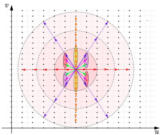 It can be seen from Figure 5 that: (a) through the length of the arrows of different colors, the size of the interval between the center point and the sampling points in each direction changes with the change of the direction angle; and (b) by setting the effective region between two points (the large, medium and small regions of the pink circle), the number of sampling points in each direction around the central point decreases with the reduction of the effective region, and some directions even have no sample points.