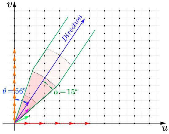 - If the geomagnetic trend is distributed along the blue line, the number of sampling points in this direction is extremely reduced (the number of blue arrows), and the sampling interval is significantly larger than the above two methods, which makes the details of geomagnetic changes in this direction easy to be ignored, thus reducing the accuracy of interpolation. At this time, in order to increase the number of samples, the area in the azimuth direction is often expanded by setting the tolerance in the azimuth direction and the lag distance tolerance, as shown in Figure 6 for the blue direction expansion in Figure 5, where the azimuth angle and the azimuth tolerance .