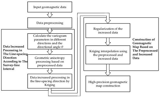 In the previous section, the geometric anisotropy correction formula was deduced. Based on this formula, a modified interpolation algorithm for sparse geomagnetic data is proposed in this section, and its flow chart is shown in Figure 7.