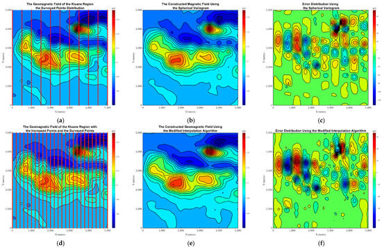 As can be seen from Figure 9a, the trend of the geomagnetic map is about 34° upward along the X direction, by calculating the relative position of two magnetic dipoles’ points (200, 2900) and (7000, 7500). Through data increase processing, the modified algorithm selected azimuth angle 35° to be the most suitable for geometric anisotropy processing. As mentioned above, it is necessary to increase the data of four routes, as shown in Figure 9d. After processing the data with the algorithm proposed in this paper, the results are shown in Figure 9e, and the comparison results between simulation diagram and interpolation diagram are shown in Figure 9f. At the same time, to verify the effectiveness of the algorithm, we use the traditional spherical variogram to process it, and the results are shown in Figure 9b. The comparison results between the simulation graph and the interpolation graph are shown in Figure 9c.