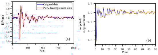 Taking an example of the LEMP waveform data recorded by the APLLN detector as a reference, the blue line in Figure 4a represents the waveform of the original data, and the red line represents the waveform data obtained after PCA compression and decompression. The dimension of the LEMP waveform data is 1000. Through experiments, it was found that when the dimensionality of the data was reduced to 90, i.e., compressed from the original 1000 sampling points to 90 feature points, the correlation between the transformed data and the original data was 98.87%. If only 90 feature points need to be transmitted through the network instead of all 1000 sampling points, it can fully meet the real-time transmission and processing of LEMP data. Figure 4b shows the results of compressing the original data using the PCA method. It can be seen from Figure 4 that the original data and the extracted data are generally consistent in the time domain.