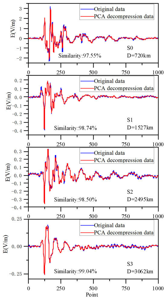 In practical applications, and are fitted from a large amount of historical data and stored in the memory of detection devices and data processing centers, respectively, for the compression and decompression of LEMP waveform data. Considering the presence of a large amount of electromagnetic noise during the propagation process, as well as factors such as propagation distance and terrain that can affect the waveform, we analyzed the LEMP data received from multiple detection sites. All LEMP signals were generated by the same lightning event. Figure 5 below shows a set of homologous LEMP signals collected from four different sites, with propagation distances ranging from 720 km to 3062 km. It can be seen that the PCA conversion results can effectively restore the original LEMP data. Using the method of signal cross-correlation to calculate the similarity of signals, the average similarity is 98.46%. This indicates that the PCA method can effectively restore the principal components of the original LEMP data without causing significant information loss due to electromagnetic noise.