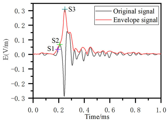 However, the arrival time of the LEMP calculated by the envelope peak method is biased with respect to the true value. As shown in Figure 6, the first pulse peak of the gray waveform can be regarded as the arrival time of the LEMP signal. The envelope peak of the red waveform is the signal arrival time determined by the envelope peak method. is the theoretical arrival time of the LEMP signal, which is the actual time it takes for the signal to travel from lightning to the detection station. From Figure 6, it can be seen that the arrival time of the real signal is earlier than the time of the envelope peak. When the distance between the detection site and the lightning is nearer, such as less than 100 km, is approximately . As the signal propagation distance increases, gradually lags behind .