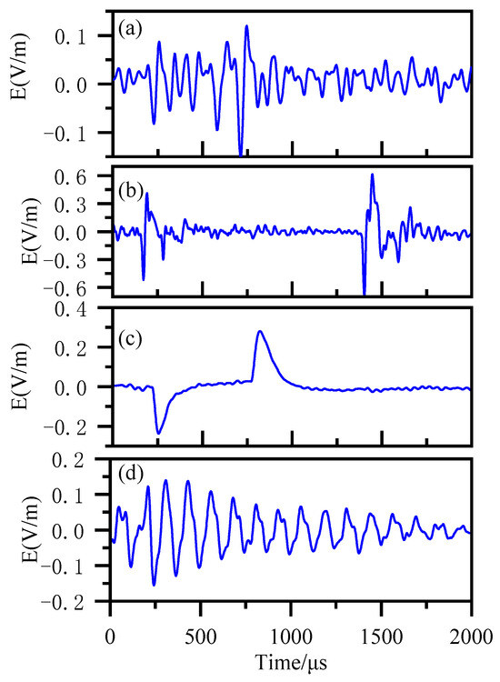 Moreover, the anti-noise ability of the envelope peak method is weak. Figure 7 lists several typical electromagnetic pulse signals that may affect the accuracy of VLF lightning location. The duration of an LEMP signal ranges from tens of microseconds to hundreds of microseconds. Therefore, we generally assumed that there is only one LEMP signal within a sampling window. As shown in Figure 2, the collected signals only have one LEMP signal, which is the case handled by most calculation processes. However, in practical applications, signals such as those in Figure 7a,b may also be encountered, where Figure 7a is a dense lightning electromagnetic pulse signal emitted by cloud flash radiation. Figure 7b shows the presence of multiple LEMP signals within a sampling window. Although both cases collect LEMP signals, the use of signal’s envelope or peak methods cannot accurately determine lightning homology, resulting in incorrect location results. Figure 7c,d show two common electromagnetic pulse interference signals, which are usually similar to LEMP and cannot be accurately removed. At the same time, due to the large amount of interference signals generated in a short period of time, it seriously affects the location calculation. When using signal’s envelope or peak methods, it can also produce incorrect location results.
