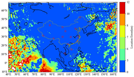 Simulation results of lightning location error. The red circles represent the geolocation of the detection sites.
