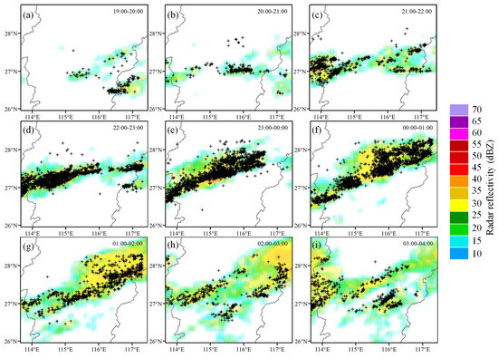 The location result of the APLLN by using the method proposed in this paper. Subplots (a–i) show the lightning location results for each hour, respectively. The symbol ‘+’ indicates the location of each lightning event.