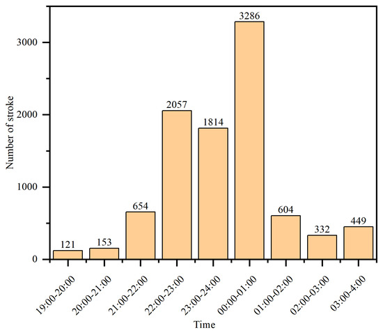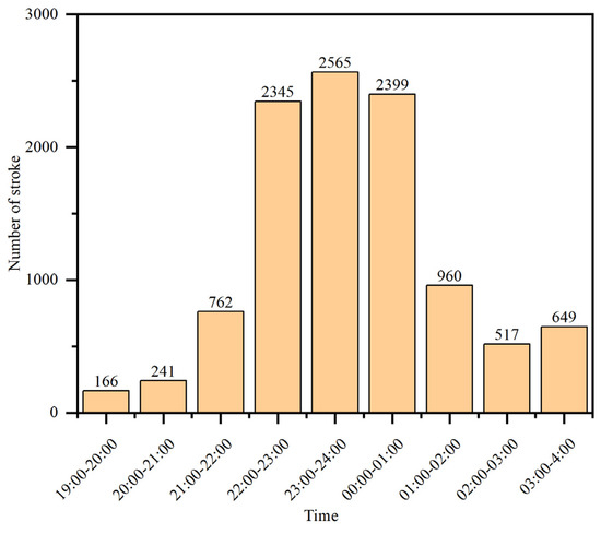As can be seen from Figure 10, the thunderstorm began at 19:00 on 22 March 2023. In the next several hours, the range of thunderstorms gradually expanded and the intensity gradually increased. The pattern displayed a westward trend, reaching its strongest within 23:00–24:00 (00:00) on 22 March 2023. Then, the thunderstorm began to weaken. The weather radar reflectivity is superimposed in Figure 10. It can be seen that the lightning location results are strongly consistent with the areas with high radar reflectivity, which verifies the accuracy of the detection results. Figure 11 shows the number of lightning events detected by the APLLN (cross-correlation method) over different periods. As can be seen from Figure 11, the maximum number of lightning strokes was 2565 at around 23:00–24:00 on 22 March 2023. The whole thunderstorm process developed rapidly and lasted a long time.