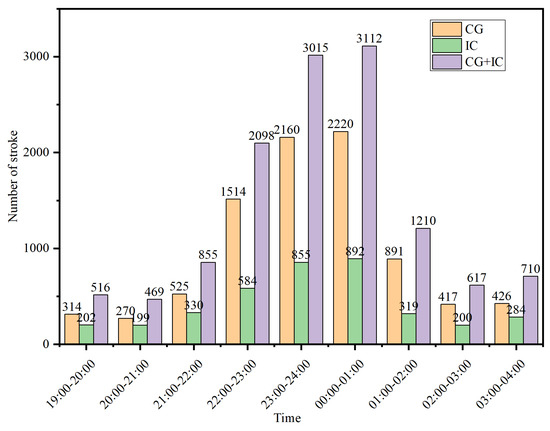 Within the same time, latitude, and longitude as described in Section 4.1 above, the location results of the APLLN (envelope peak) showed that a total of 9470 lightning strokes were detected. Figure 12 shows the lightning scatter distribution by hour. It can be seen that the development trend of thunderstorm activity monitored by the above cross-correlation method is consistent. However, from 00:00 to 01:00, it can be seen that the anti-noise ability of the envelope peak method is poor, and the monitored data are doped with a lot of noise signals.