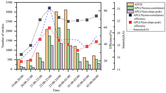 The detection efficiency is related to the peak current intensity and propagation distance of lightning. As the peak current intensity becomes stronger, the signal propagation distance becomes farther in the Earth–ionosphere waveguide and could be detected by more detection sites. From Figure 16, it can be seen that from 19:00 to 20:00, the relative detection efficiency of the APLLN is significantly lower. During this period, the average peak current intensity of lightning detected by the ADTD is 15.7 kA, which is significantly lower than other time periods. This also indicates that the improved the APLLN geolocation algorithm has a lightning detection efficiency of over 60% for lightning above 20 kA.