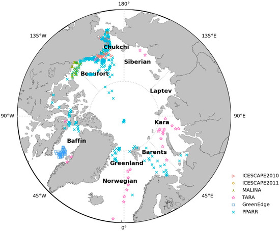 Map of the Arctic Ocean showing the locations of stations from various datasets.