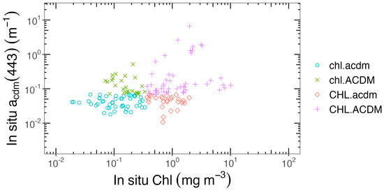 To evaluate algorithms from the perspective of the impact of CDM, we arbitrarily split the algorithm-evaluation dataset into 4 water types. For this purpose, missing values were estimated according to [39]. Then, based on the measured median value of Chl (0.35 mg m−3), we split the in situ dataset in half. For the half with Chl 0.35 mg m−3, samples with 0.067 m−1 were classified as chl.acdm, while those with > 0.067 m−1 were regarded as chl.ACDM. The same procedure was applied to the other half of the dataset with Chl > 0.35 mg m−3, thus deriving CHL.acdm and CHL.ACDM. This classification approach is illustrated in Figure 2 and Table 2.