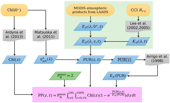 The spectrally resolved primary-production model for the Arctic waters developed by [18] was adopted in the present study. One advantage of this model compared to others [17,45,46] is its consideration of the propagation of spectral light in the atmosphere and the ocean, using methods appropriate for both Case 1 and Case 2 waters. In recent years, this model has been further optimized to account for subsurface chlorophyll maxima often observed in the AO. This was achieved using the statistical relationships between Chl at surface and at depth, published by [47]. Furthermore, instead of using and Chl data from the GlobColour dataset as in [18], the present study used -merged products based on SeaWiFS, MERIS, aqua-MODIS and VIIRS data from OC-CCI for better coverage and derived Chl products through the merged products using the above-mentioned chlorophyll algorithms.