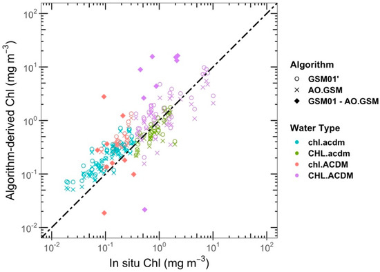 To give a comprehensive comparison of the two GSM models, Table 6 summarizes the performance metrics for each water type. According to the wins, AO.GSM outperformed GSM01 for chl.acdm and chl.ACDM, but lost for CHL.acdm and CHL.ACDM. Figure 6 shows the pair-to-pair comparisons, with the diamond symbols representing the samples which failed with AO.GSM but succeeded with GSM01. The latter all belonged to water types with high CDM, and most of them were located far from the 1:1 regression line. When excluding these diamonds, AO.GSM outperformed GSM01, with 71.0% wins (see Table 6). It was thus shown that AO.GSM has the ability to eliminate retrievals with poor performance.