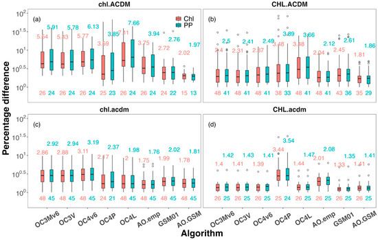 The same boxplots of percentage difference between PP-Ref and PP-Algorithm are shown in Figure 6. It can be seen that the percentage differences of PP followed the trends of Chl, and the rankings of MAE reflected those of Chl but with relative larger values. Taking the best algorithm AO.emp as an example, the MAEs of PP were 0.5%, 3.4%, 5.1% and 3.9% larger than those of Chl for water types chl.acdm, CHL.acdm, chl.ACDM and CHL.ACDM, respectively. In addition, the amplifications of difference from Chl to PP were generally greater in waters with a relatively high proportion of CDM. Overall, considering all the algorithms, the amplification of difference from Chl to PP, largely due to the statistical approximation of the vertical Chl profile, did not exceed 7%.