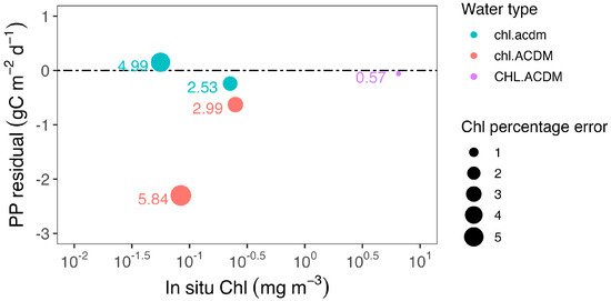 Relationship between PP absolute error (PP estimated from in situ Chl subtracted from measured PP) and in situ Chl through matchup analyses. Labels refer to percentage errors of Chl estimates. A value of 4.99 means overestimation by 399%, while a value of 0.57 reflects 43% underestimation.