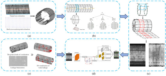 Workflow of the proposed method: (a) extracted central axis and ideal section points in the shield tunnel point cloud; (b) constructing cylindrical voxel structure in shield tunnel point cloud; (c) generation of 2D intensity images based on the cylindrical voxel structure of the tunnel point cloud, where the red points are the axis points and the blue points and green points are the ideal (design) cross-section points; (d) segmentation and localization of water leakages by Mask R-CNN; (e) 3D visualization of water leakages.