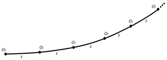 Based on a specified point on the axis, tunnel cross-sections perpendicular to the tunnel axis can be extracted. This paper adopts the method proposed by Kang et al. to extract the cross-section [41]. Firstly, the axes extracted from the shield tunnel are subdivided as required. Since some axes of the shield tunnel are curved, and straight lines are a special case of zero curvature, they are uniformly treated as curves. As shown in Figure 3, given the tunnel intercept section interval and the location of the first intercept section (axis point O0), the exact location of each intercept section (axis points O1, O2, O3, etc.) can be determined by using the formula for calculating the arc length.