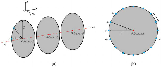 Subsequently, the shield tunnel section is extracted from the starting axis point O0, and the section at axis point O0 is labeled as section O0. First, the section is divided into a series of rays in the normal plane at a given interval . Then, the section is first divided according to the given interval , and a series of rays in the normal plane is obtained; then, the section point is obtained in the section with the axis point O0 as the starting point at a fixed angle , and , where , located in the section, is generated by taking the point in the section; next, another vector , where , is taken in the section, (“×” is the cross-multiplication symbol). Finally, the arbitrary vector in the section with O0 as the starting point and every can be linearly represented by the normalized and (as shown in Figure 4).