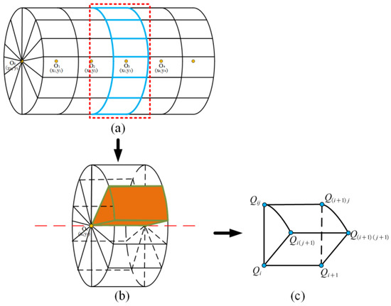 To construct a cylindrical voxel, it is first necessary to select two adjacent section points, Q00 and Q01, based on the initial section O0 and the corresponding section points Q10 and Q11 in the adjacent section O1. Then, a cylindrical voxel based on the constraints of section center O0 (i.e., the axial point), section points Q00 and Q01 of section O0, section center O1, and section points Q10 and Q11 of section O1 can be constructed (Figure 5c). Additionally, the point cloud data within this range are grouped into this voxel based on the KD tree for storage. With the above method, we can realize cylindrical voxelization of the shield tunnel point cloud and construct a cylindrical-voxel structure inside the data. Let the total length of the shield tunnel be L and the section radius be r; the centroid angle of two neighboring sections within the same section is , and the distance between neighboring sections be d1. The number of cylindrical voxels in the two neighboring sections is , and the total number of cylindrical voxels in the shield tunnel is .