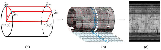 The process of generating a 2D intensity image by cylindrical projection involves three steps: (1) the raw point cloud data are projected onto a standard cylindrical surface, (2) the point cloud plane on the cylindrical surface is unfolded to the top plane of the cylinder, and (3) the 2D point cloud is converted to a 2D intensity image using the intensity data of the point cloud [26,48]. Among them, the cylindrical surface projection refers to projecting the measured point cloud onto a standard design cross-section. Figure 13 illustrates the unfolding of the tunnel point cloud onto a cylindrical surface.