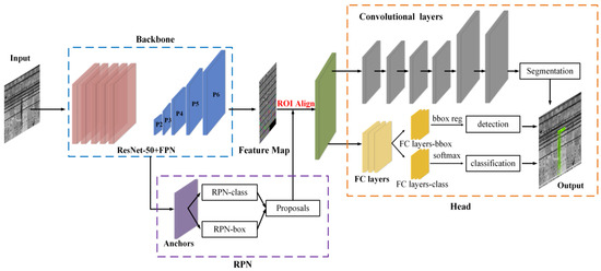 The Mask R-CNN is a popular two-stage instance segmentation framework typically employed in the detection of water leakage [42,43,44,45]. This study applies the Mask R-CNN to automatically detect water leakage in 2D images. The overall architecture of Mask R-CNN consists of three parts, namely, the leading backbone network (ResNet-50 + FPN), the region proposal network (RPN), and the head structure, as shown in Figure 8.