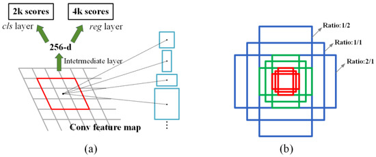 Diagram of the RPN: (a) the process of RPN, the blue boxes represent the anchors of different sizes; (b) generate anchors, the blue, red and green boxes represent the anchors of various sizes and aspect ratios.