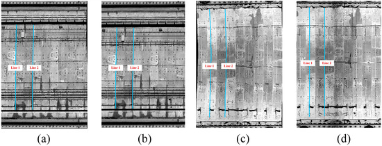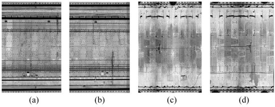 Subsequently, based on the number of cylindrical voxels normal and transverse to the shield tunnel, the values of m and n that constitute the intensity image are determined, and according to Section 3.1.2, the value of m is , and the value of n is . In general, the smaller the m and h are, the greater the image resolution; however, if m and h are too small, the amount of computation will increase, and the null value of the cylindrical voxels will also increase, affecting the image quality, and the size of m, n is related to the parameters θ and d1. For the determination of θ and d1, taking the MLS point cloud data as an example, we set four sets of parameters (Table 1) for generating the 2D intensity images of the tunnel (these parameters are the representative ones selected from a large number of tests). The 2D intensity images generated by these parameters are shown in Figure 6. Among them, θ represents the height of the 2D unfolded images, and d1 represents the width of the unfolded images.