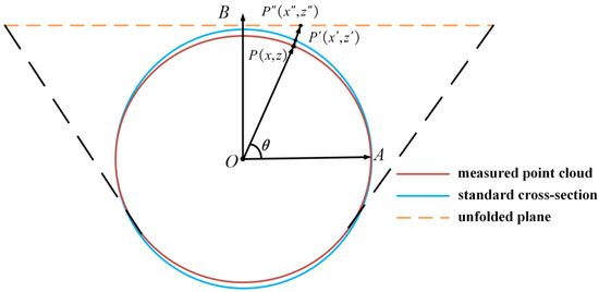 First, the tunnel point cloud is projected to the standard design cross section centered on the cylindrical fitting center point , as shown by the blue line in Figure 13, where is the positive unit vector of the X axis, is any point in the point cloud, is the point vector after projection of , , and is positive when it is rotated positively counterclockwise around the X-axis. Therefore, the projected can be obtained based on Equation (6).
