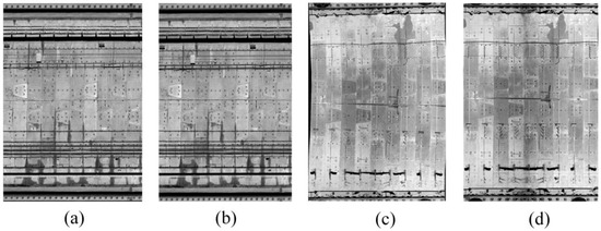 Two-dimensional intensity images selected from Data_1, Data_2, Data_3, and Data_4: (a) generated by the MLS point cloud based on the cylindrical projection method; (b) images generated by the MLS point cloud based on the cylindrical voxel projection method; (c) images generated by the slightly curved TLS point cloud based on the cylindrical projection method; (d) images generated by the slightly curved TLS point cloud based on the cylindrical voxel projection method.