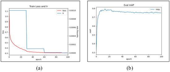 Variation curves of the learning rate, loss value, and mAP: (a) change in the learning rate and loss value; (b) change in the water leakage segmentation accuracy mAP.