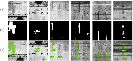 Results of the segmentation of water leakages: (a) the original tunnel lining images with water leakages; (b) the ground truth corresponding to the water leakages; (c) the results of the water leakages segmentation output by the Mask R-CNN.