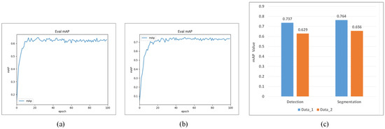 The mAP curves of leakage segmentation: (a) the method combined with cylindrical projection and Mask R-CNN; (b) the method combined with cylindrical voxel and Mask R-CNN; (c) comparison of leakage detection and segmentation mAP values for Data_1 and Data_2.