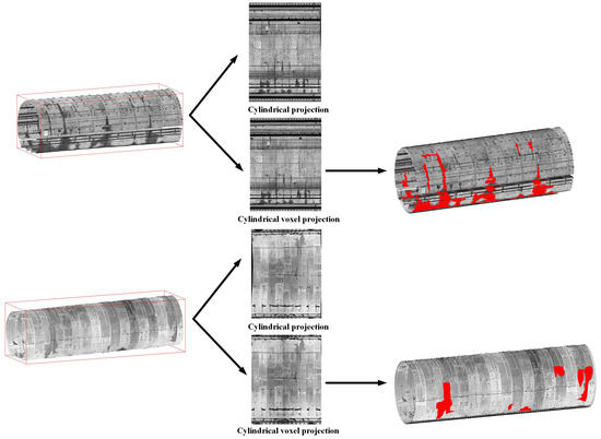 After the above analysis, we conclude that the 2D intensity image generated by the cylindrical voxel projection method proposed in this paper outperforms traditional cylindrical projection methods in multiple ways. This method not only improves image quality but also more accurately reveals the water leakage inside the tunnel, providing us with richer and more accurate information.