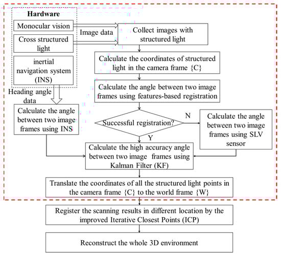 In this part, the coordinates of the points on structured light planes are calculated first. The vertical structured light plane is used to scan the surroundings and the horizontal structured light plane is used to estimate the angle change between two adjacent measurements. Then, a KF with simple construction is designed to fuse the inertial information from INS. The framework of methodology is shown in Figure 1. In particular, the core algorithms are summarized in the red dashed box. After collecting an image containing cross-structured light, calibration of the SLV sensor is performed (the details will be described in Section 3.2) to determine the rotation and translation relationship between the cross-structured light sensor and the camera. The three-dimensional coordinates of the structured light in the camera frame {C} can then be calculated. By solving for the Euclidean distance, the distance from any structured light spot to the camera in each frame can be obtained. During the process of rotating and scanning the environment in the 3D reconstruction system, the angle between two frames is calculated through feature-based image registration to compensate for low illumination or a lack of features leading to registration failure. In cases where image registration fails, the angle between two frames is calculated using the method described in Section 3.3.1. Subsequently, the KF method described in Section 3.3.2 is used to fuse the angle measurements from the inertial sensor and the SLV sensor, yielding more accurate inter-frame angles. These inter-frame angles represent the rotation relationship of the camera frame {C} at each adjacent moment. Finally, by mapping the measured structured light coordinates in each frame to the corresponding moment’s camera frame {C} using the inter-frame angles, a three-dimensional environment reconstructed by the SLV sensor scanning a full circle is obtained.