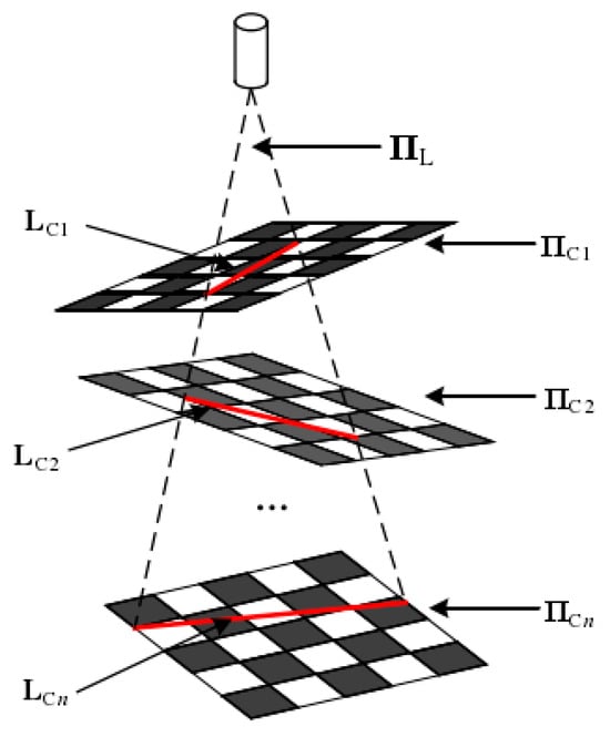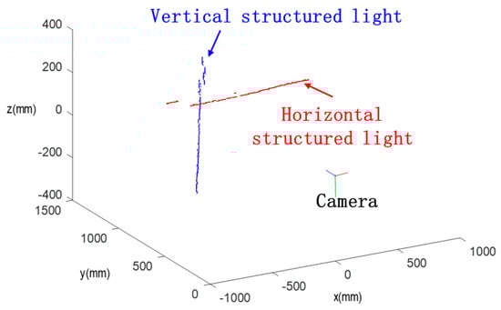 where the rotation matrix is and the translation matrix is , which means the distance from vertical structured light plane to the camera center is and the distance from the horizontal structured light plane to the camera center is . Both can be estimated by calibration as follows [47,48]: