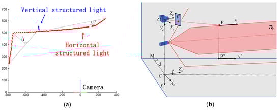 In the cross-structured light frame, assume that point is on the vertical structured light plane, which means that ; Equation (2) can be represented as follows [17]:
