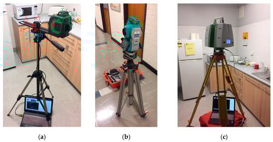 In previous decades, a laser scanning technique was developed to build a 3D environment model with time efficiency and high accuracy [6,7]. Laser scanners measure the distance, horizontal angle and vertical angle of a point to obtain the 3D coordinate of the point. For a commercial laser scanner, the scanning module is mounted inside with high frequency so that it can measure a full scene with millimeter-to-centimeter accuracy at speeds of thousands to hundreds of thousands of measurements per second [8]. Due to the high accuracy of terrestrial laser scanning (TLS) in both distance measurement and angle measurement, the most widely researched aspect of laser scanning-based reconstruction is how to use points clouds of environments rather than how to obtain the points clouds. The points cloud obtained from a laser scan station is used to build detailed models of walls, doors, windows, etc., which are called building information models (BIMs) [9,10]. However, the high cost and weight of equipment and the difficulty of cloud point processing must still be improved.