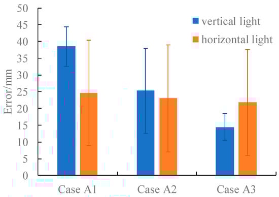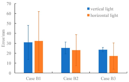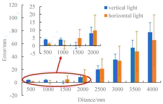 For each case, distances from 500 mm to 4000 mm with 500 mm intervals are measured by the SLV system. The mean errors and RMSEs of all the measurements in each case are shown in Figure 8.