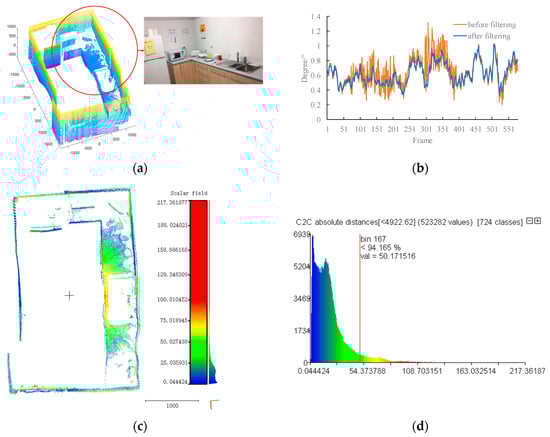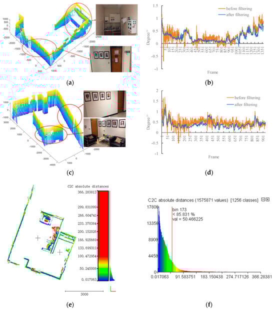 Figure 11a,c shows the partial real environments and the results of the reconstruction. It can be seen that not only large objects such as the water heater and first-aid box are well reconstructed, but the photos on the wall can also be clearly seen. Figure 11b,d shows an estimation of the heading angle changes before and after filtering. The accuracy of angle estimation is improved by fusing the measurement of INS. In Figure 11e, the scanning results in different locations are registered by improved Iterative Closest Points (ICPs) [51]. The two black crosses represent the location of two scans. Although the glass table, the bolster on the sofa and the window on the door have an error larger than 100 mm, most of the points have an error of less than 50 mm. Figure 11f shows that about 85% of the points have an error of less than 50 mm.