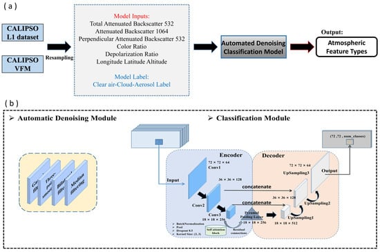 After processing the automatic denoising module to the 532 nm attenuated backscatter coefficient, the 1064 nm attenuated backscatter coefficient, and the 532 nm vertical attenuated backscatter coefficient data, the depolarization ratio and color ratio were computed using Equations (1) and (2). Latitude, longitude, and altitude information were then incorporated. The resulting data were amalgamated into model input variables (comprising a total of eight features, as depicted in Figure 1), normalized within the 0–1 range and standardized to a consistent size (72 (height pixel size) × 72 (along-track pixel size) × 8 (number of features)) for training, validation, and testing purposes.