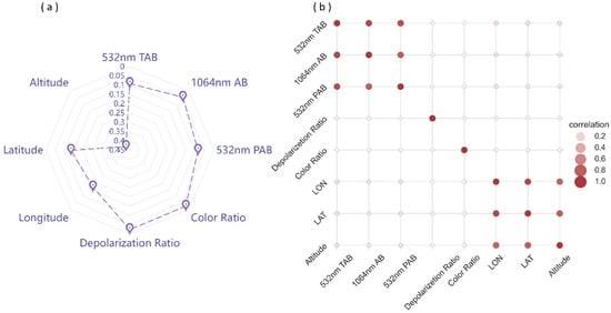 (a) Feature importance score chart. Feature importance scores are obtained based on the extreme tree model. (b) Feature correlation chart. Darker colors indicate higher correlations. The scale axis in (a) is reversed, with higher values closer to the center. Note: 532 nm TAB = 532 nm total attenuated backscatter, 532 nm PAB = 532 nm perpendicular attenuated backscatter, 1064 nm AB = 1064 nm attenuated backscatter.