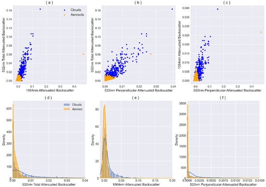 Excluding geographical features, the feature importance scores of 532 nm total attenuated backscatter, 532 nm perpendicular attenuated backscatter, and 1064 nm attenuated backscatter data are all at relatively high levels, significantly contributing to the model. Moreover, the correlation between these three types of data exceeds 0.9, indicating a strong linear relationship between these features. However, directly removing features with high correlation may result in the loss of essential information, leading to a decline in model performance. For this issue, residual connections and self-attention mechanisms can provide better assistance: when highly correlated portions exist in the features, residual connections help the model more easily learn this residual information, mitigating redundancy among features; self-attention mechanisms enable the model to assign different weights to distinct features during learning, allowing better adaptation to highly correlated situations. This helps the model to automatically learn dependencies between features, reducing redundant information. Furthermore, through clustering analysis of partial region samples, it is concluded that all three features contribute to better cloud and aerosol classification. As shown in Figure 3a–c, aerosol samples are mainly concentrated in the low-value regions of the three features: 532 nm total attenuated backscatter (0~0.014), 532 nm perpendicular attenuated backscatter (0~0.007), and 1064 nm attenuated backscatter (0~0.0065), forming distinct clusters. Figure 3d–f indicate that the distribution range of cloud samples is larger, with more aerosol samples concentrated in the lower-measurement-value area.