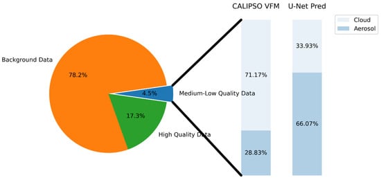 To quantify the differences between the U-Net model and the CALIOP classification algorithm, predictions were made based on the U-Net model for the medium- and low-quality data. As evident from the confusion matrix in Table 4, there is poor consistency between these two techniques, with a consistency of 22.82% for clouds and 27.92% for aerosols. The U-Net model tends to identify more aerosols, with an aerosol predicted ratio reaching 43.25%. We then applied the U-Net model to predict the medium- and low-quality data from the spring of 2019. As shown in Figure 5, the proportion of clouds and aerosols in CALIPSO VFM products was 71.17% and 28.83%, respectively. However, the U-Net model’s predictions exhibited significant disparities, with proportions of 33.93% for clouds and 66.07% for aerosols.