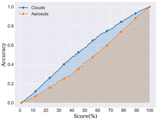 The reliability verification of predictions for medium- and low-quality data poses a challenge. The U-Net model can output classification probabilities for each sample ranging from 0 to 100%. The study proposes using these classification probabilities to represent the reliability of predictions for medium- and low-quality data. Considering machine learning algorithm characteristics, higher classification probabilities generally indicate a higher confidence level in the model’s prediction for a specific category of input samples. Additionally, the study examined the impact of confidence levels for cloud–aerosol samples on model accuracy, as illustrated in Figure 6. The results indicate a positive correlation between the confidence levels of cloud–aerosol samples and model accuracy. This further supports the aforementioned hypothesis. In the subsequent sections, we attempt to use confidence levels to demonstrate the reliability of predictions for medium- and low-quality data. Furthermore, the growth curve of cloud samples consistently remains above that of aerosol samples, suggesting that cloud samples are generally easier to identify. This aligns with expectations, as aerosol types are diverse and complex, exhibiting significant differences in physical and chemical characteristics between different types, making them more challenging to identify [5].