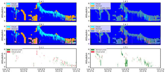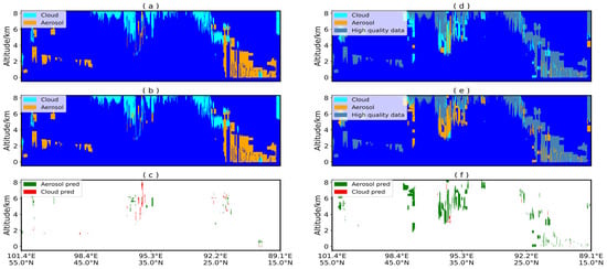 Comparison between U-Net model predictions and CALIPSO VFM product results; 17:58 UTC, 8 February 2019. (a–c) show the model’s predictions for high-quality data; (d,e) show the model’s predictions for medium- and low-quality data. (a,d) CALIPSO VFM Product; (b,e) U-Net model identification results; (c,f) Identification discrepancies. Note: Green indicates cloud layers in the VFM product identified as aerosol layers by the model, while red indicates aerosol layers in the VFM product identified as cloud layers by the model.